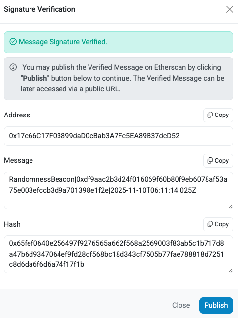 Click the Verify Signature button available on Etherscan. The Verify Signature window is displayed.