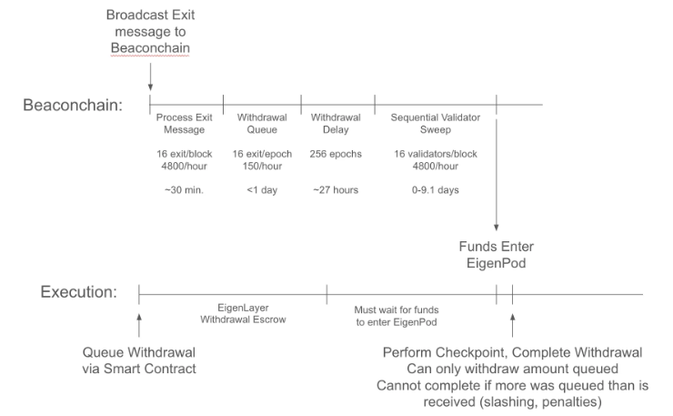 - Overlapping these steps requires knowing the exact amount to withdraw ahead of time to prevent issues with overestimating (which leads to delays) or underestimating (which leaves residual funds in the EigenPod).